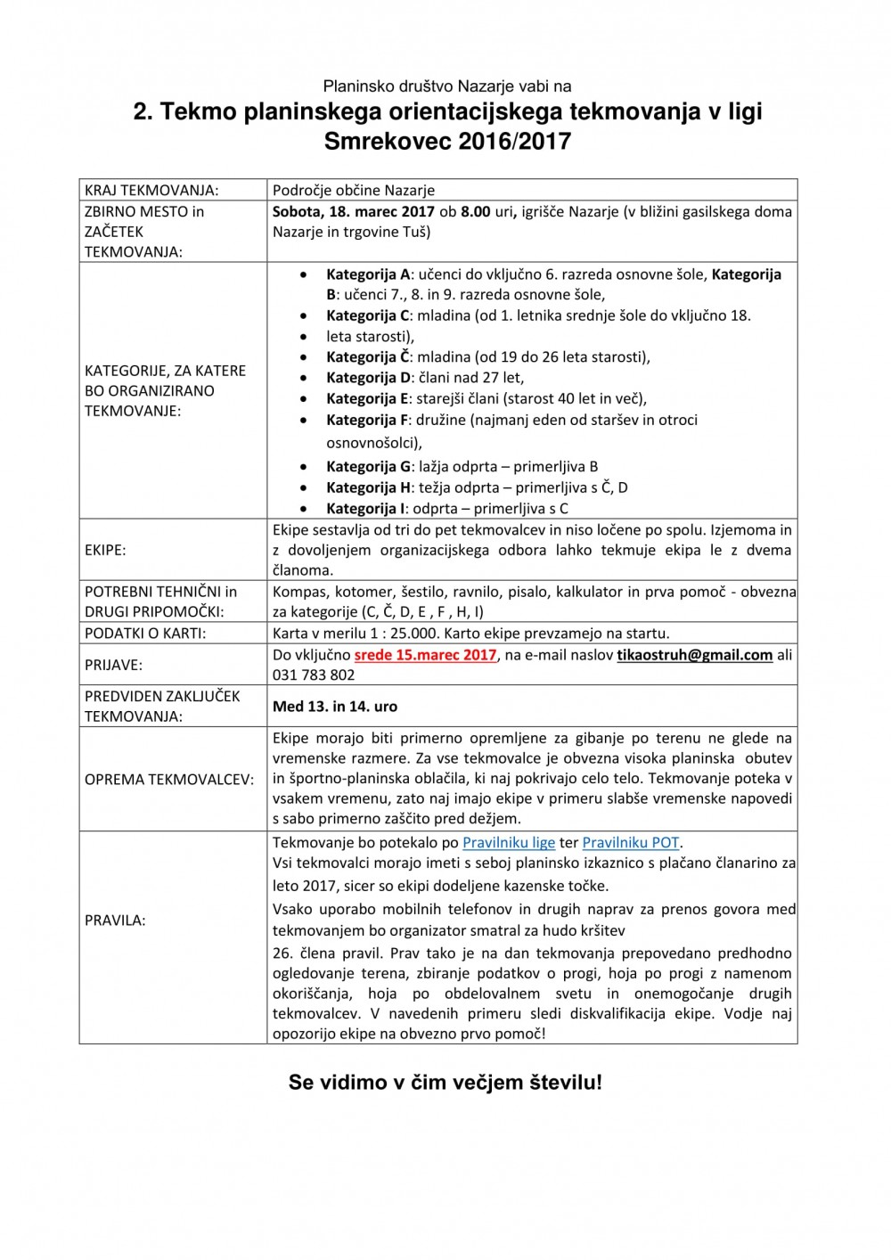 18.03.2017 / Tekmovanje, ogledov: 4524POT Nazarje | Vrsta dogodka | Tekmovanje | Kdaj | 18.03.2017 8:00, igrišče Nazarje | Kje | Nazarje in okolica | Društvo | Planinsko društvo Nazarje | Primernost | Primerno za družine | Ostali dogodki in aktivnosti ta dan:
