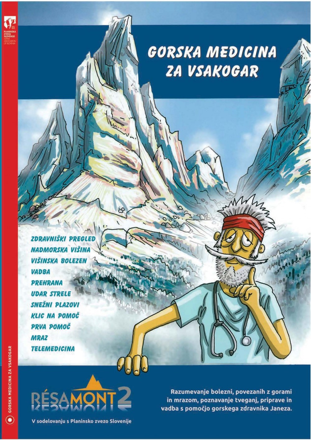 ponedeljek, 12. junij 2017 ob 14:00, ogledov: 14655 Strip Gorska medicina za vsakogar| Objavil(a): Manca Ogrin | | Na pobudo gorskega zdravnika letalca Jurija Gorjanca je pod okriljem Odbora za usposabljanje in preventivo PZS izšel brezplačen strip Gorska medicina za vsakogar, ki s pomočjo gorskega zdravnika Janeza na moč slikovito predstavi razumevanje bolezni, povezanih z gorami in mrazom, poznavanje tveganj, priprave in vadbo. | Janez je gorski zdravnik in vodnik, ki sodeluje na številnih gorskih tekmovanjih in odpravah. Zaradi njegovih bogatih izkušenj ima vzdevek "ekspert Janez". Gore so lepe, toda tudi visoke in mrzle, zato sledimo Janezu, ki nas vabi, da prelistamo pričujoči strip, v njem preberemo veliko nasvetov in se naučimo uporabnih trikov o aklimatizaciji in zaščiti pred mrazom. Izvemo, kako biti v vrhunski formi in kaj jesti. Gore morajo ostati kraj užitka, srečanja in osebne rasti, ne pa kraj nesreč in poškodb.