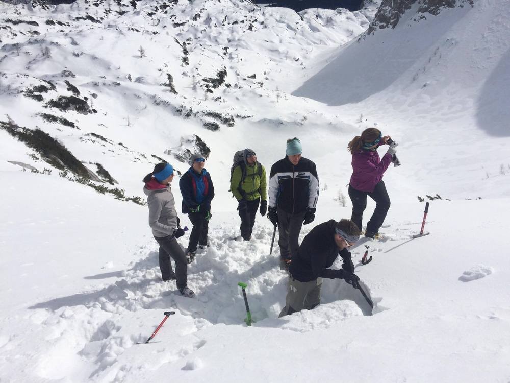 Sobota je bila fizično bolj sproščena, posvečena je bila teoriji, kar se mi je po naporni turi, moram priznati, kar prileglo. Teme so se v vrtele okrog plazov, različnih vrst vremenskih napovedi, lavinskega biltena ter priprave na turo. Praktičen pouk je zajemal iskanje žoln, odkrivanje posledic nenastavljene budilke in igro skrivalnic v gozdu. Nekateri smo ob pordelih obrazih ugotavljali, kako pomembna so, ne glede na letni čas, sončna očala in krema v gorah.