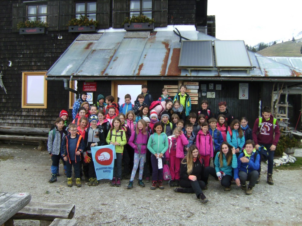 Kako se je po triurnem vzponu prilegel počitek v lepo urejeni koči z zelo prijaznim skrbnikom. Zadišalo je po slastnih štrukljih in toplem kakavu. Ker pa smo planinci težko na miru, smo kmalu pospravili in se pred kočo lovili, plezali po plezalni steni, se spuščali po toboganu. Po skupnem fotografiranju smo se po drugi strani hriba spustili v dolino.