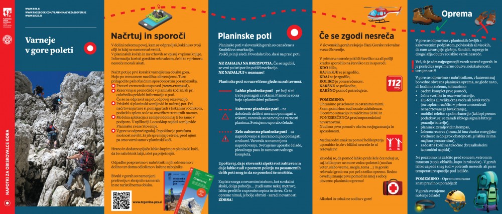 Slovenski alpski svet je zahteven in zahteva odlično pripravljenega posameznika z izkušnjami in znanjem uporabe opreme. Da bo vaš korak varnejši, da bo z vami v gorah primerna oprema, da se boste znašli na planinskih poteh ali v primeru nesreče v gorah, je Planinska zveza Slovenije v sodelovanju z Gorsko reševalno zvezo Slovenije pripravila dvojezično zgibanko z napotki za varnejši obisk gora poleti.