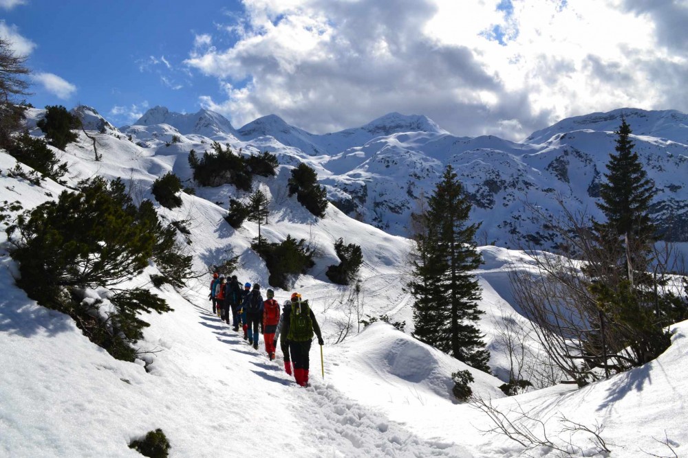 Tečaj bo sestavljen iz nekaj predavanj in veliko praktičnih vaj. Naučili oz. ponovili bomo obvezno opremo, varno hojo v gorah v zimskih razmerah z derezami in cepinom, ustavljanje s cepinom, iskanje zasutega v plazu, prerez snežne odeje in še marsikaj drugega.
