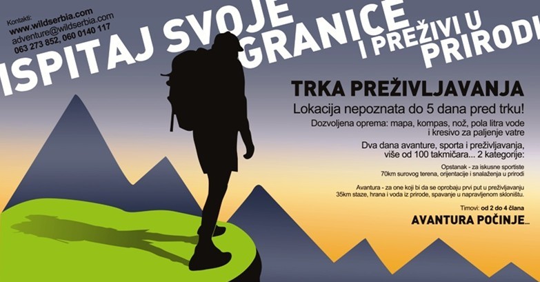 sobota, 8. september 2012 ob 00:00, ogledov: 6307 Tekma preživetja v Srbiji| Objavil(a): Zdenka Mihelič | | Vabljeni na tekmo preživetja, »Trko preživljavanja©«, na katero vas vabi Wild Serbia iz Valjeva. To bo že četrta tekma po vrsti in tudi tokrat obljubljajo polno izzivov in nepozabnih doživetij. Tekma bo 29. in 30. septembra 2012, vabljeni. |