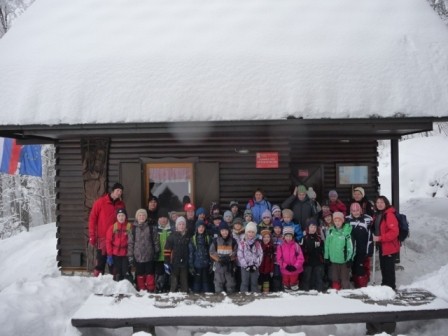 Še zadnja strmina pod cerkvijo. Mladi planinski snežaki pa na vse štiri, samo da bi bili prvi pri cerkvi, sledila je le še ozka gaz do koče. Pred kočo je Milan ometal naše čevlje, da je ne bi preveč pobelili s snegom. Kako prijetno toplo je bilo v njej! Čeprav ni velika, je bilo prostora poleg nas še za kakšnega pohodnika. Spili smo topel čaj, pomalicali in izpolnili planinske dnevnike. Pospravili smo še za seboj in se poslovili od prijaznih oskrbnikov. Pred kočo smo se za spomin nastavili še fotografskim objektivom.
