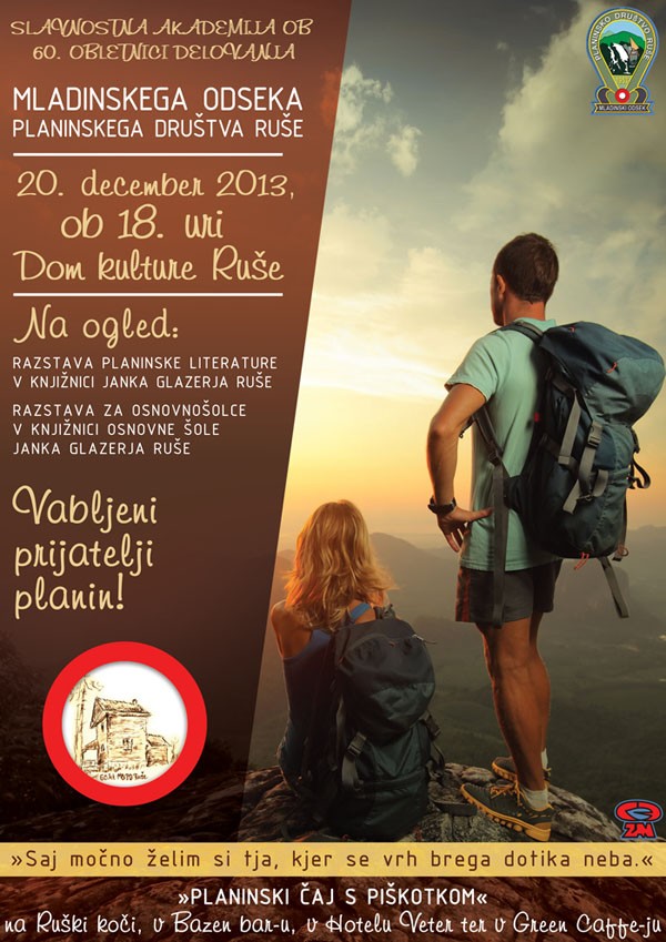 Mladinski odsek Planinskega društva Ruše vas prijazno vabi na SLAVNOSTNO AKADEMIJO ob 60. obletnici delovanja, ki bo 20. decembra 2013, ob 18. uri, v Domu kulture v Rušah.